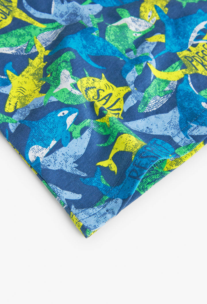 This is a printed T-shirt for boys, made from knit fabric. It's perfect for spring and summer wear. The shirt features a round neck and short sleeves, making it comfortable and easy to wear. The sizes range from 4 months to 16 years. The shirt is decorated with a unique print, adding a touch of fun to the design. The colour is indigo blue, a versatile shade that can be paired with various bottoms. This printed T-shirt is a great addition to any boy's wardrobe, offering both style and comfort.