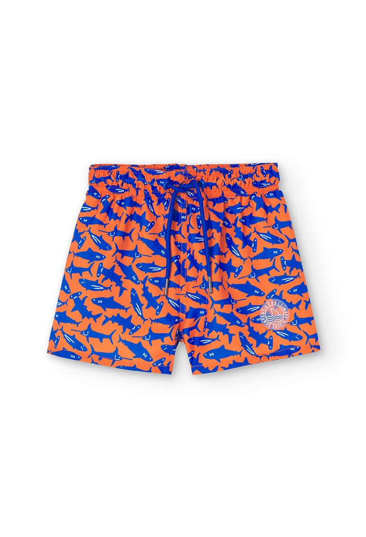 This is a technical fabric swimsuit for boys, available in sizes ranging from 2 months to 16 years. The garment is flat woven, making it durable and comfortable for active children. It features a vibrant orange colour, perfect for the summer season. The swimsuit is decorated with a fun print, adding a playful touch to the design. Ideal for swimming lessons, beach days, or just splashing around in the garden, this swimsuit combines practicality with style. It's easy to clean and quick to dry, making it a great choice for busy parents.