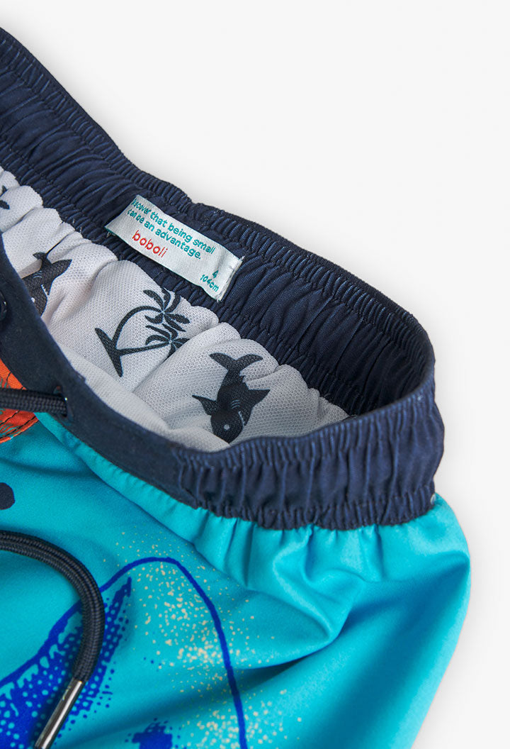 This is a technical fabric swimsuit for boys, available in sizes from 2 months to 16 years. It's a summer essential, perfect for fun in the sun. The swimsuit is in a vibrant turquoise blue colour, sure to stand out at the beach or pool. The fabric is flat, providing comfort and ease of movement. The swimsuit features a playful print, adding a touch of fun to the design. It's a practical and stylish choice for any boy's summer wardrobe.