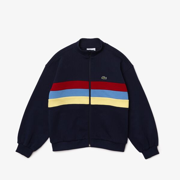 Kids’ Colorblock Bands Fleece Zip Sweatshirt-Cotton fleece-Ribbed stand-up collar and zippered fastening-Relaxed fit-Contrast bands on chest and side pockets-Embroidered green crocodile on chest