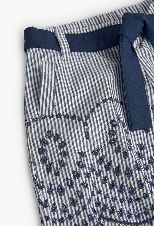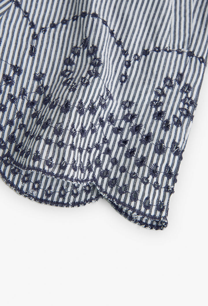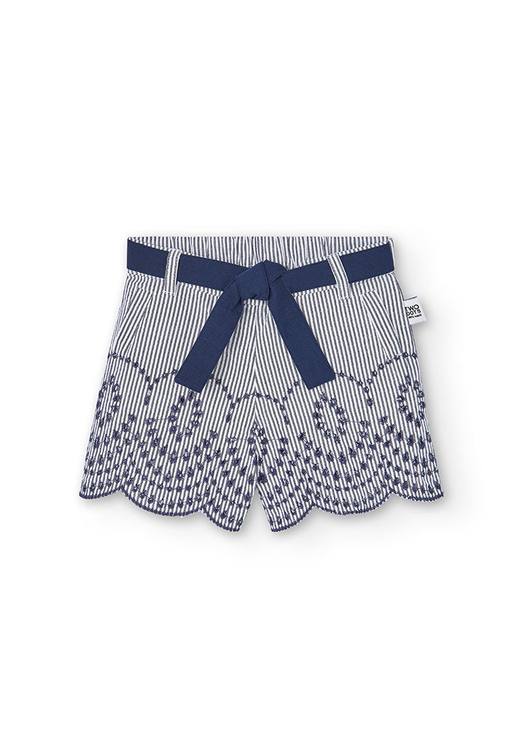 This is a girl's striped poplin short, perfect for summer. It comes in a navy blue striped pattern, adding a playful touch to any outfit. The fabric is flat, ensuring comfort and durability. It's available in sizes ranging from 4 months to 16 years, catering to a wide age range. The shorts feature a bow closure, making it easy for your child to wear and remove. Ideal for warm weather, this short is a must-have in your child's wardrobe.